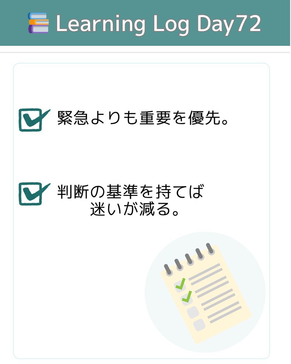 📚 Learning Log(Day72) 💡タスクに優先度をつける 緊急よりも、重要を優先。 判断の基準を持てば、迷いが減る。 #Notion #タスク管理 #優先順位 pic.x.com/5pNnTuWpuZ