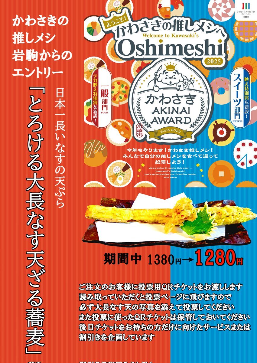 かわさき推しメシエントリーしました!岩駒庵からの推しメニューは日本一長いナスの天ぷら「とろける大長なす天ざる蕎麦」です!期間中推しメシ価格でやってますので是非お試しぐください。#元住吉 #グルメ #そば pic.x.com/fYkxACQhHc