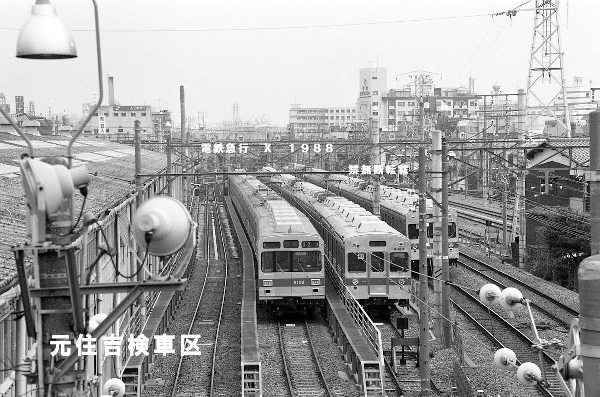 元住吉検車区(1988年撮影) 奥が武蔵小杉方面です。当然タワマンなんて1棟もありません。検車区は地上にあり本線によって東西に分断されていました。#東急 #元住吉 pic.x.com/P7JEtFCiD7
