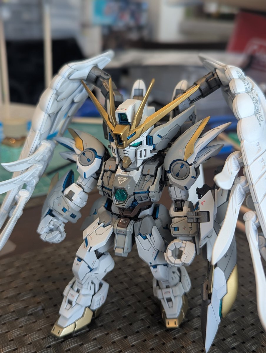 右前腕の前後ろが反対やけど、とりあえず完成。挿し色の青がお気に入りです。 #ガンプラ #ウイングゼロ #MGSD #スノーホワイト #全塗装 #ガンプラ好きと繋がりたい pic.x.com/vogD50w1UF