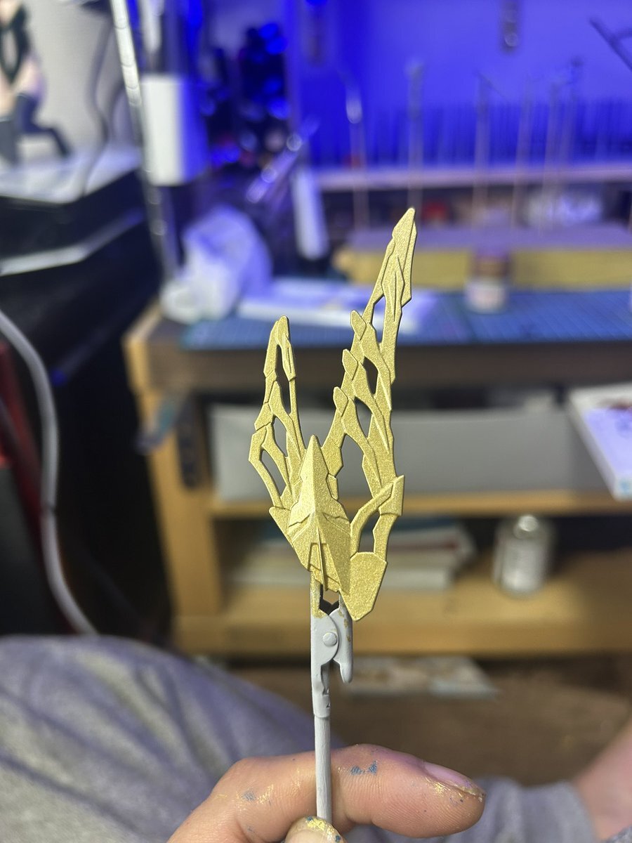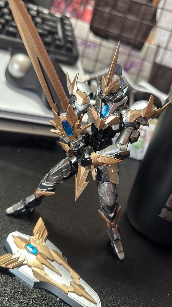 もうちょっと鮮やかな色調で、ギラツキがあるくらいが良かったかなあ。 ゴールド塗装は難しい😥 私的メモ 下地①:100均ツヤありブラックラッカースプレー 下地②:EXシルバー 調色:EXゴールド+EX光沢クリアー(1:1) クリア塗装:EXクリアー3回 #リーベルナイト #リーベルホーリーナイト #全塗装 pic.x.com/hiiaDxAUlU