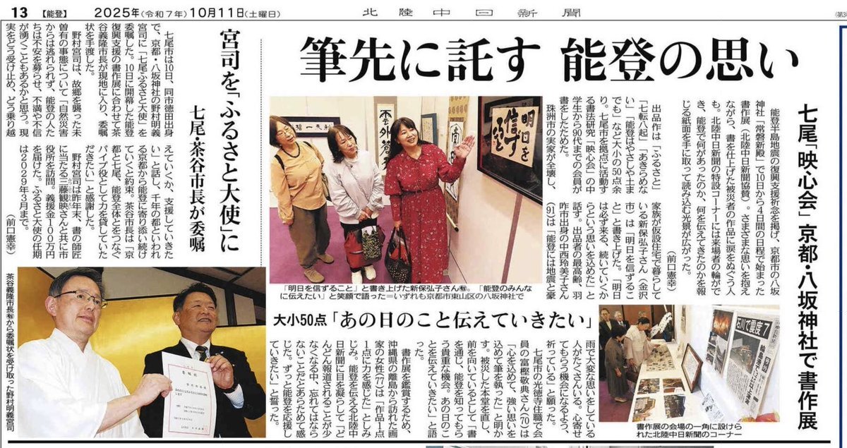 3年前に右手がまひし、左手に筆を持ち替えた石川県七尾市の僧侶で書家の三藤観映さんの作品が、京都・八坂神社で開催中の書作展に並んでいる。「大病にも地震にも負けん。あきらめん気持ち、能登の人、全国の人に伝えたい」と祈る。 chunichi.co.jp/article/1147309 #八坂神社 #七尾市 #三藤観映