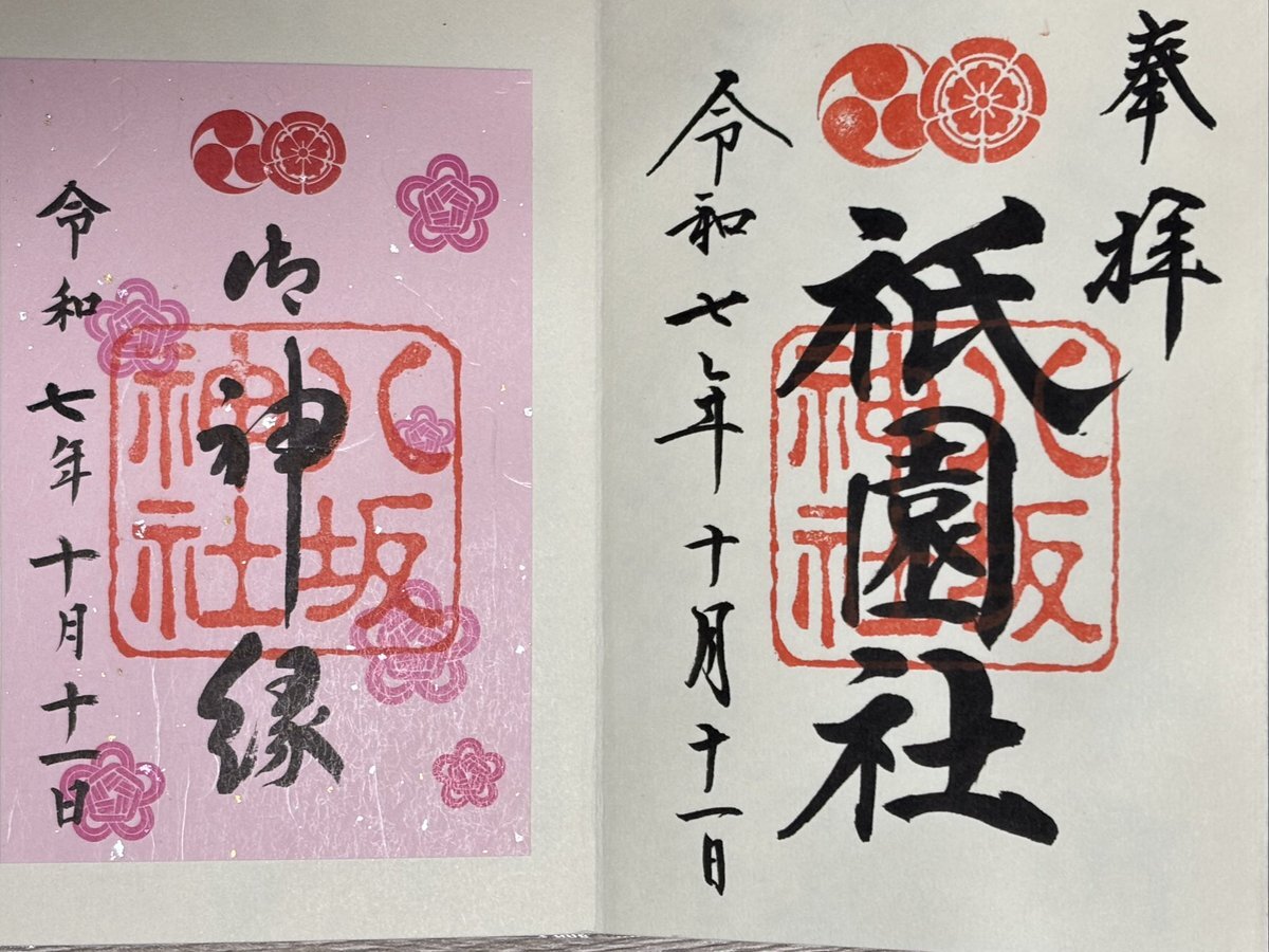 初めて行きました、祇園さん。 華やかでした。 直書きしていただけます。 置き書、祇園さんみが強い桃色を選びましたが、どうやら縁結びらしい。 間違えたー。 #御朱印 #八坂神社 pic.x.com/7Mimma1ata