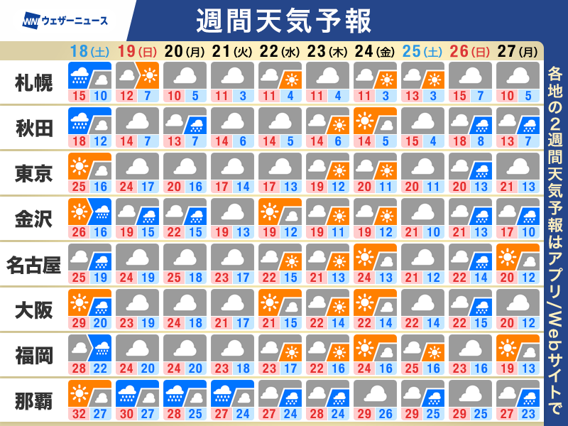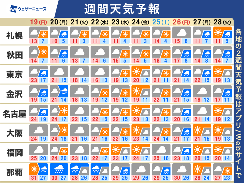 【週間天気】 ・北海道は寒気の影響受け雪の可能性も ・南岸に前線停滞 週前半ほど雨の可能性 ・全国的に季節進む 東京も11月並み予想 詳しくはこちら→weathernews.jp/news/202510/19…