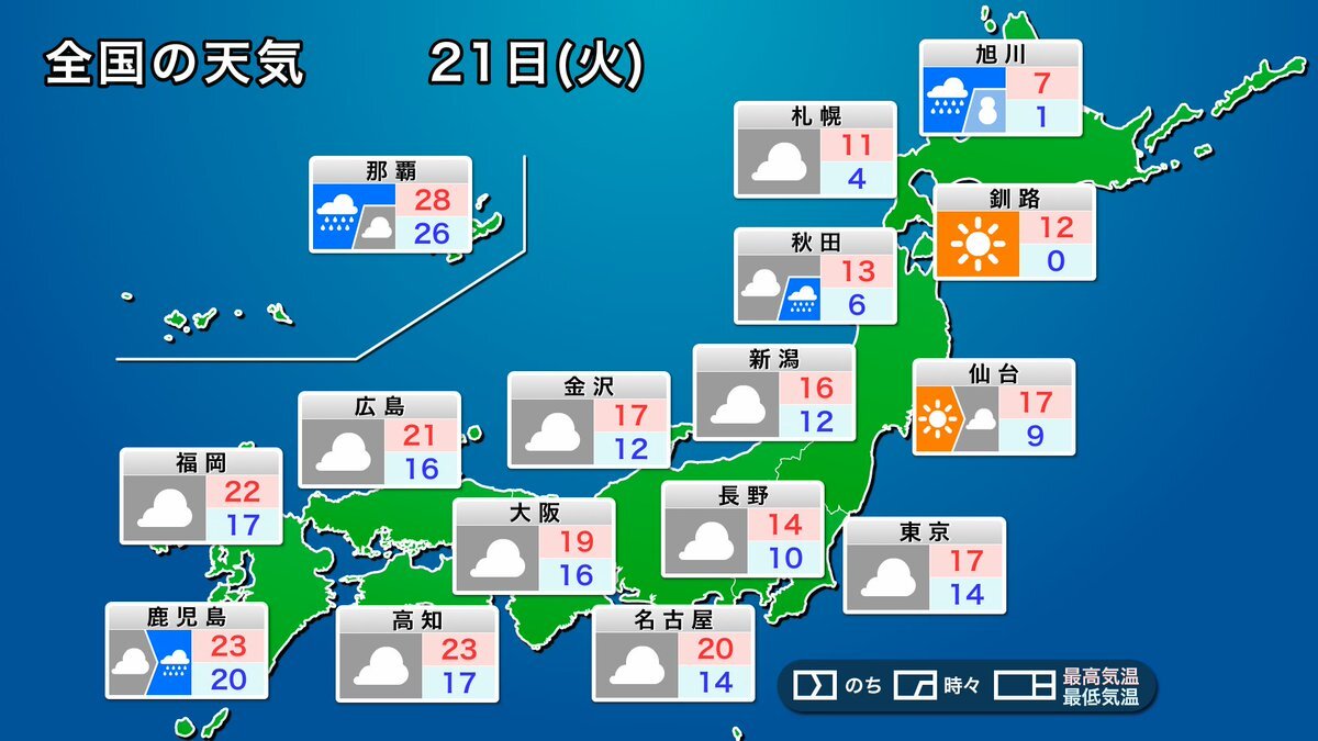 【明日の天気】 明日21日(火)は本州の太平洋沿岸に前線が停滞します。北日本は寒気の影響を受け、全国的に曇りや雨の所が多くなりそうです。 北海道の山沿いでは雪の積もる所もあり、車の運転に注意をしてください。 weathernews.jp/news/202510/20…