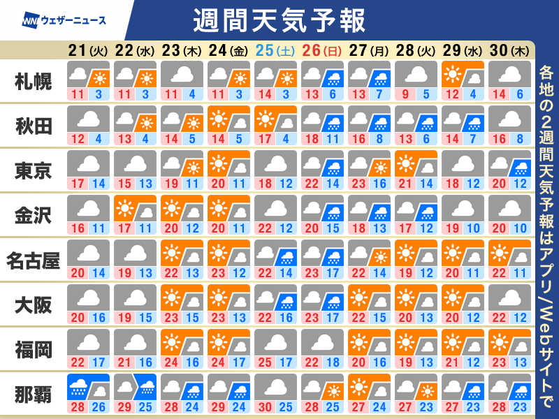 【週間天気】 ・北海道は寒気の影響で内陸は雪の日も ・南岸に前線停滞 週末は雨の可能性 ・全国的に季節進む 東京で11月下旬並み予想も ▼詳しくはこちら weathernews.jp/news/202510/20…