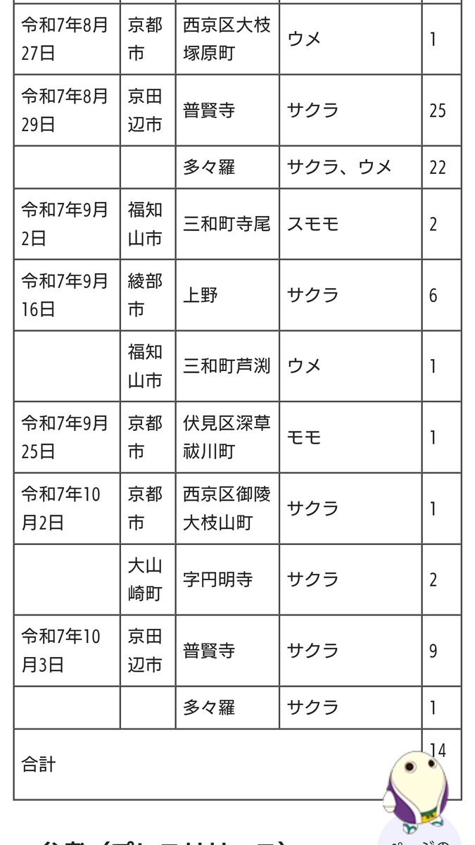 #京田辺市 の被害木が47本から更に10本増えた。 9月初に「府市職員が現地調査を実施」されたので、約1か月で新たに別の木からフラスの排出があったのだろう。 蛹室を作る今が来年の被害を抑えるチャンスか。 #精華町#木津川市#八幡市 ももはや? #クビアカツヤカミキリ pic.x.com/AdLrUbIufk
