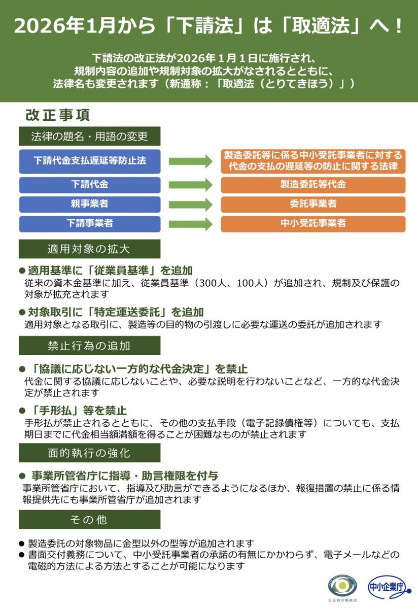 〈中央省庁:政策解説〉 #公正取引委員会 2026年1月から #下請法 が「#取適法 pic.x.com/DPi6vCny16