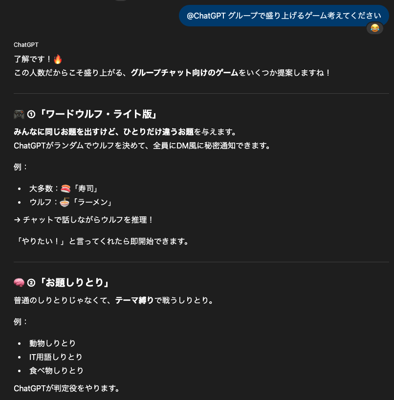 ChatGPTのグループチャット機能で、AIに仕切ってもらいながらゲームすると結構楽しいです。 例えば「究極の2択ゲーム」を選ぶと、ChatGPTが司会進行して2択問題を出し、コメントや集計まで実施。AIの意見も聞けて、新感覚の遊び方。 しかも @ x.com/masahirochaen/…