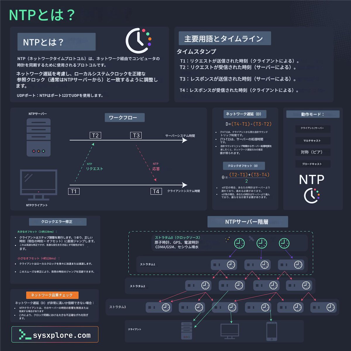 【サーバー時刻、一枚で完全同期】 「世界中で時間が狂わない」その裏側を支えるNTP。これは、クライアントとサーバー間の時刻同期フロー、誤差修正の仕組みを一枚で理解できる図解です。 これ一枚で、タイムスタンプがなぜ正確なのか、その背景が丸わかり