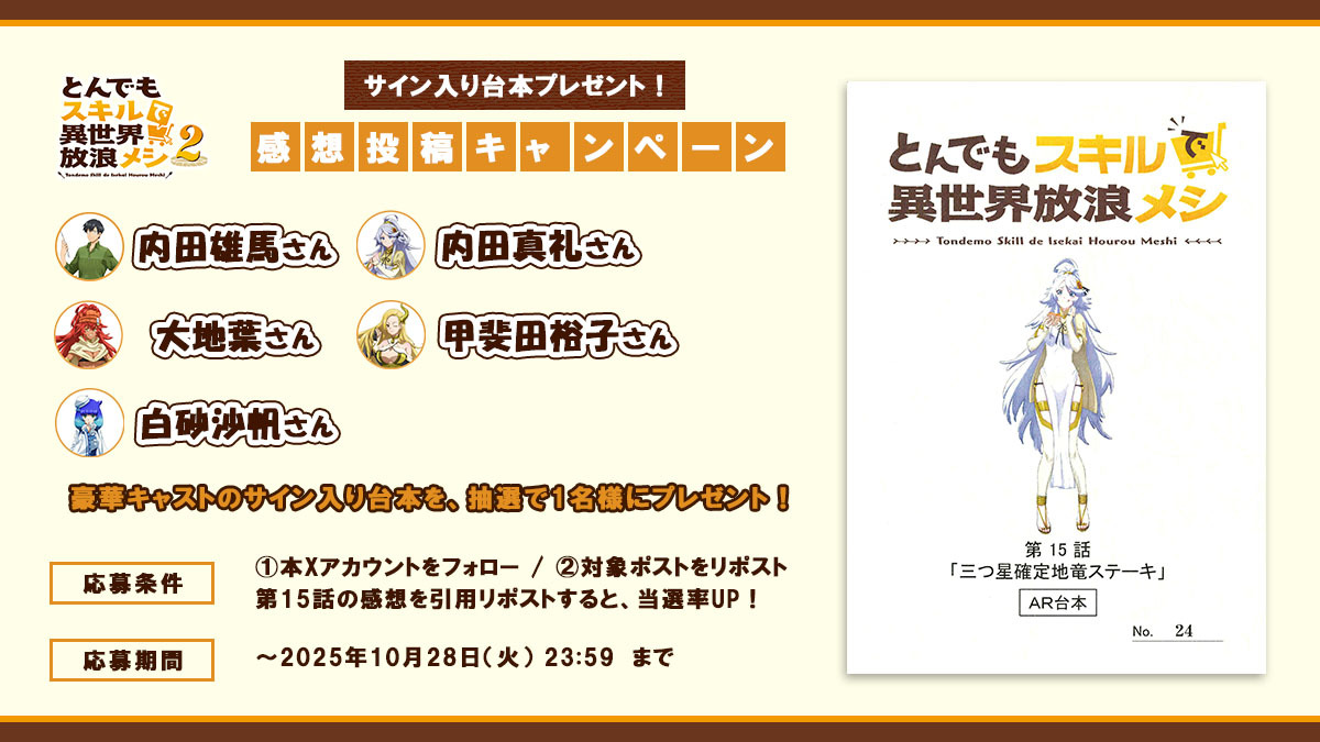 『#とんでもスキルで異世界放浪メシ 2』 ✨🎁台本プレゼントキャンペーン🎁✨ 『#とんでもスキルで異世界放浪メシ 2』、第15話放送を記念し、 #内田雄馬 さん #内田真礼 さん #大地葉 さん #甲斐田裕子 さん #白砂沙帆 さん の サイン入り台本を1⃣名様にプレゼント! 🥩応募方法✨