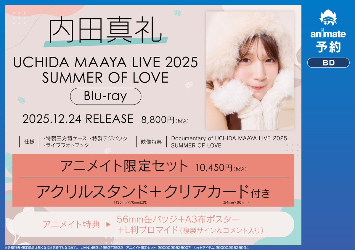 【映像予約情報】 12/24 発売 Blu-ray『UCHIDA MAAYA LIVE 2025 SUMMER OF LOVE』 ご予約受付中✨ 🎁アニメイト限定セット 🔹アクリルスタンド+クリアカード 🎁アニメイト特典 🔹56mm缶バッジ+A3布ポスター+L判ブロマイド #内田真礼 🔽バーコード簡単予約はコチラ🔽 animate-onlineshop.jp/pd/3253655/?ut… pic.x.com/Qkp3BWWHYZ