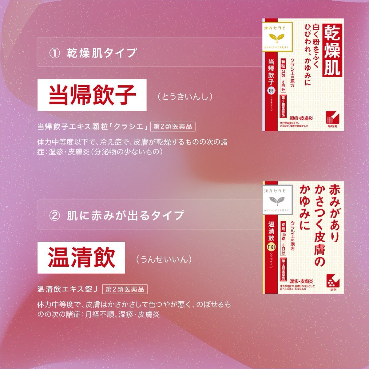 肌の悩みといっても、症状は人それぞれ。 乾燥肌の方には #当帰飲子 (とうきいんし)🌿 肌に赤みが出る方には #温清飲 (うんせいいん)🌿 漢方薬で、肌悩みを改善させましょう😌 #漢方セラピー #肌悩み #乾燥肌 #赤ら顔 #冷え症 #冷え性 #のぼせ #皮膚炎 pic.x.com/fmzUYC1YCy