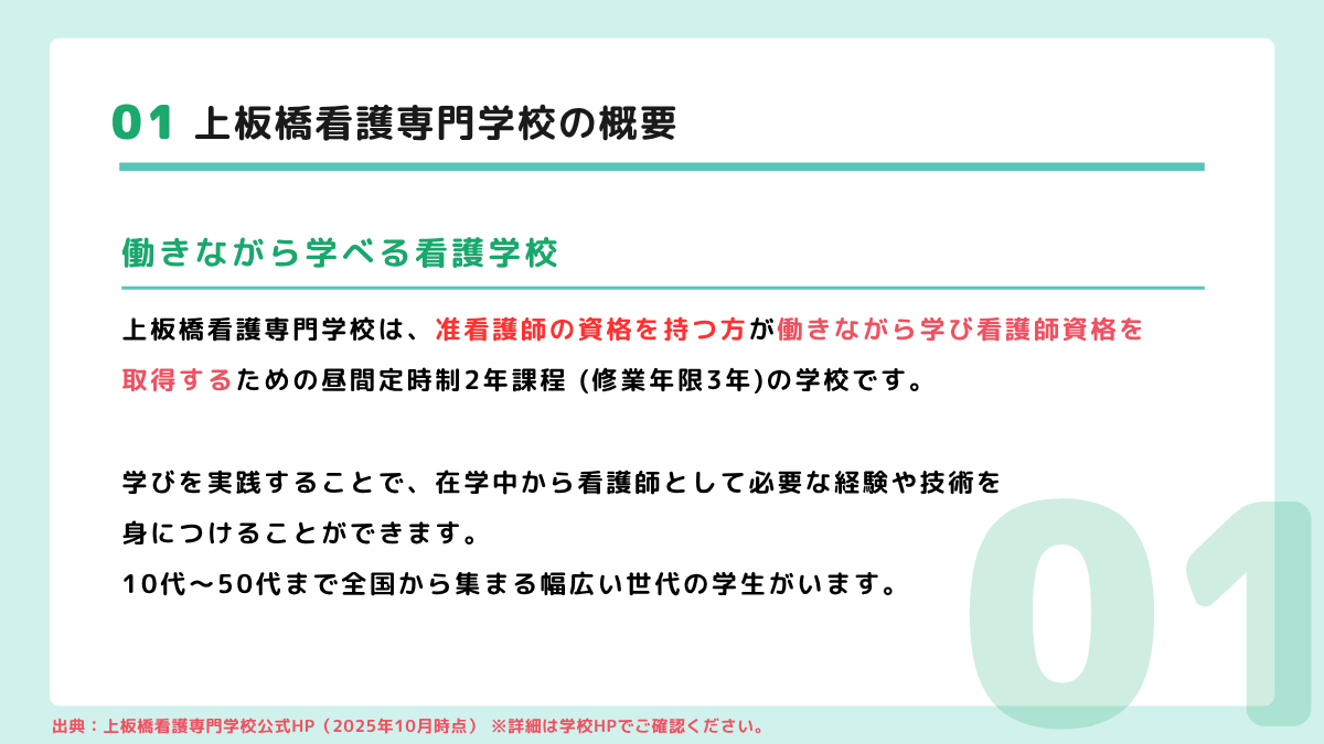 東京都板橋区にある【上板橋看護専門学校】の特徴をまとめました📋 【准看護師の資格を持つ方】が、働きながら学び看護師資格を取得するための昼間定時制2年課程 (修業年限3年) の学校です。 詳細は公式HPへ👇 kamiita-kango.jp #看護学校 #准看護師 pic.x.com/rfth5yrdYn