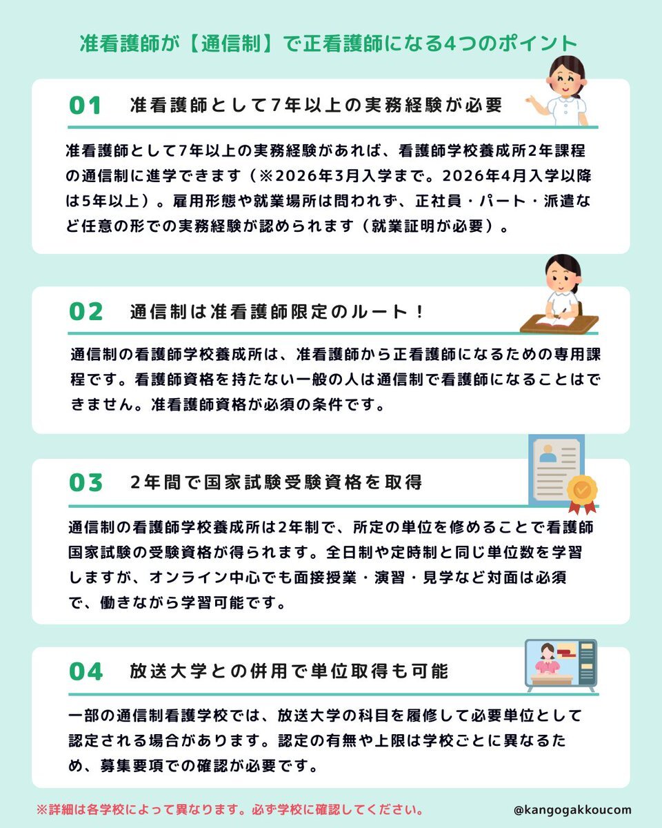 准看護師から正看護師になりたいけど、仕事を続けながらは無理? そんなことはありません。通信制なら働きながら准看護師から看護師を目指せます。4つのポイントをまとめました👇 #看護学校 #准看護師 pic.x.com/3vuEFRwd6w