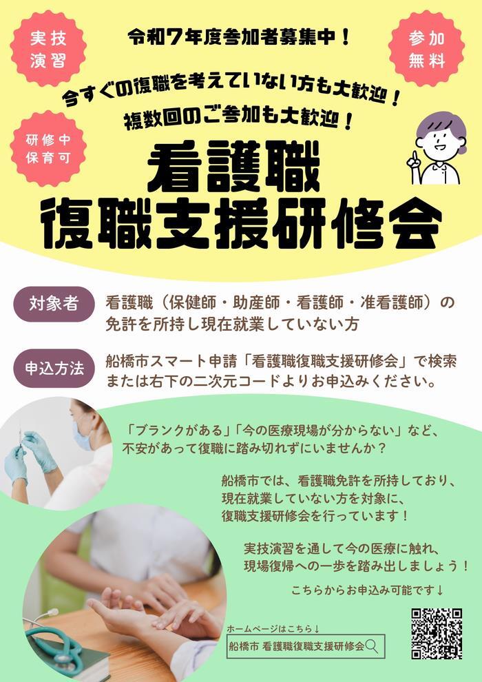 \ 🌼参加者募集中🌼 / 看護職資格を持ち、現在就業していない方向けに 研修会を開催します! 船橋市にお住まいでない方も大歓迎✨ お申込はこちら▼ ttzk.graffer.jp/city-funabashi… 詳しくは市HPをご覧ください▼ city.funabashi.lg.jp/event/experien… #船橋市 #看護師 #准看護師 #保健師 #助産師 #復職 pic.x.com/sfC522LYh2