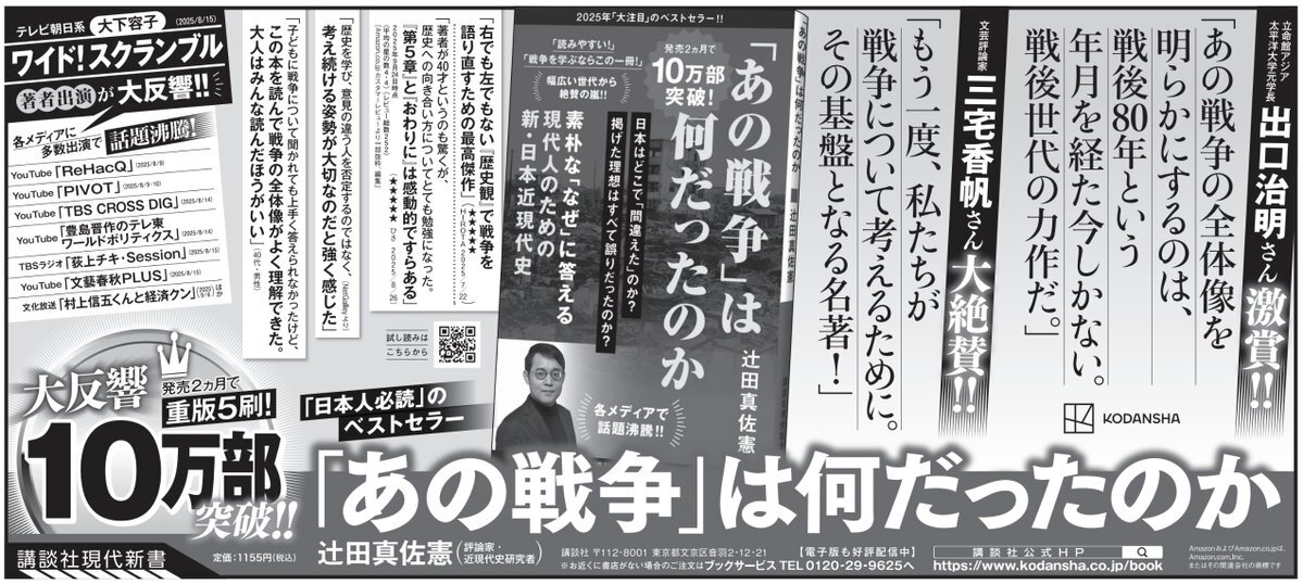 ㊗️amazon総合50位まで上昇中⤴️✨ あの戦争の全体像を明らかにするのは、 戦後80年という年月を経た今しかない。 戦後世代の力作だ。 (#出口治明 さん激賞!!) ぜひ書店店頭で手に取ってみてください📚 10万部突破新帯の展開も始まっています✨ #チームあの戦 #辻田真佐憲 #講談社現代新書 pic.x.com/JjzLPxmvVz x.com/reichsneet/sta…