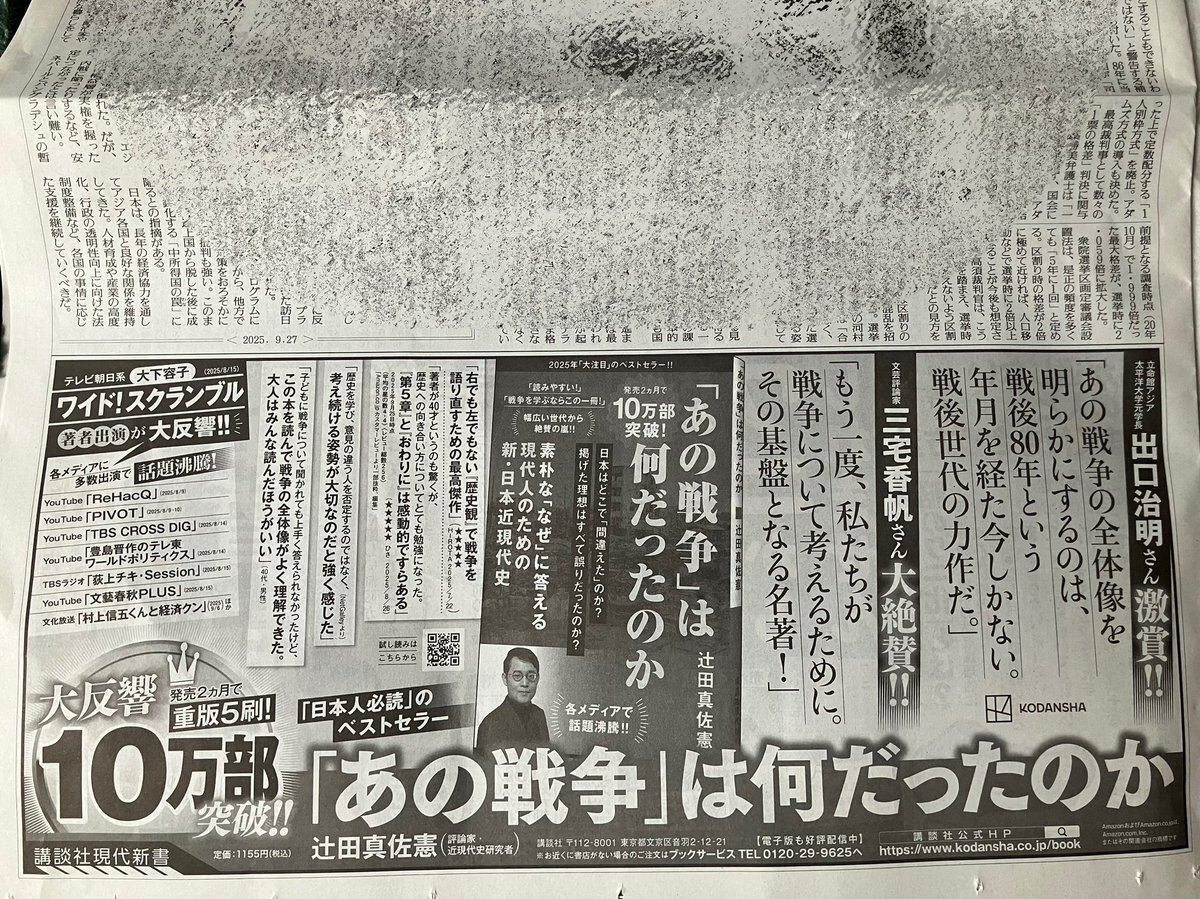 9/27付 #読売新聞 朝刊に「#あの戦争は何だったのか」広告掲載中🗞️ あの戦争の全体像を明らかにするのは、 戦後80年という年月を経た今しかない。 戦後世代の力作だ。 (#出口治明 さん激賞!!) #チームあの戦 #辻田真佐憲 #講談社現代新書 pic.x.com/T3nYH9aVJn