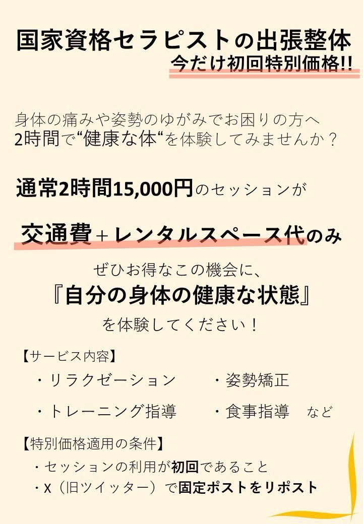 【国家資格セラピストによる出張整体】 通常2時間15,000円 ➡︎ 今だけ❗️交通費+会場費のみ❗️ ✅こんなお悩みに対応しています 肩こり・腰痛・姿勢のゆがみ など 不調の改善から理想の身体づくりまで幅広くサポートします。 ※活動範囲は関東圏となります ご依頼はDMにて❗️ #出張整体 #姿勢改善 pic.x.com/VtGHJp7Tjd