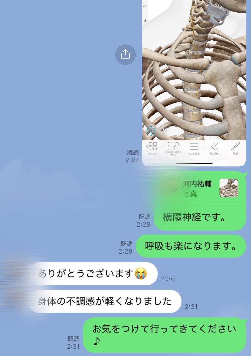 @AkiInoueUnic 先日はありがとうございました🥼 コロナの後遺症が酷く、嗄声のようになっておりました。 マイスナー小体 、パチニ小体 、ルフィニ終末 、自由神経終末 にアプローチしだるさや癒着、血行不良の改善と呼吸誘導を行い 反回神経を緩め胸椎伸展を促しました。 #出張整体 #コロナ後遺症