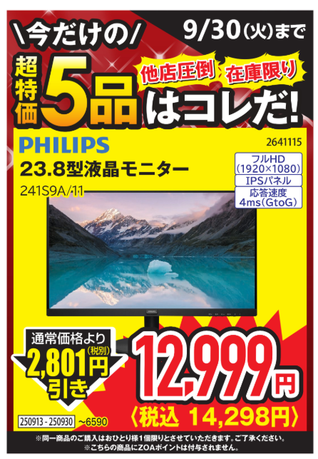 🖥️【9/30まで限定】 PHILIPS 23.8インチモニター ➡ 2,801円引き! 12,999円(税抜) 大画面&高画質で快適作業✨ 在宅ワークにもデュアルにもこれでOK👌 #OAナガシマ #ZOA #沼津 #三島 #駿東郡清水町 #函南 pic.x.com/TxNfKU3qKE
