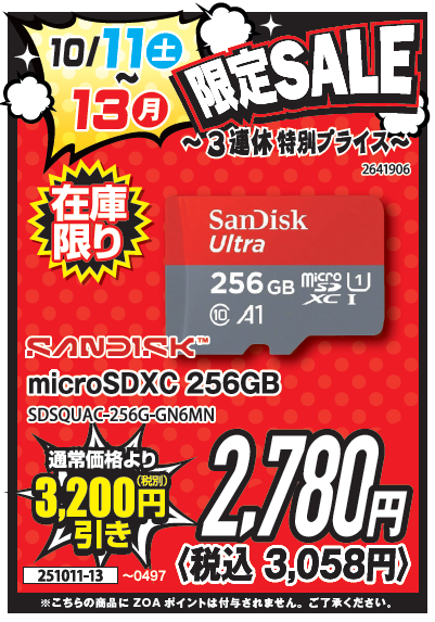 📣10/11~13 三連休限定価格 microSDXC 256GB ▶ 通常価格より3,200円引き ▶ 特価 税抜2,780円💾 在庫限りの特別セールです! #限定特価 #セール情報 #microSD #OAナガシマ #ZOA #沼津 #三島 #駿東郡清水町 #函南 pic.x.com/Aye37IUM8L x.com/oroshidanchi/s…