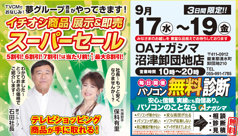「社長!また赤字価格ですか!?」 #夢グループ 大感謝セール💥 再び開催🎉 ✔ 健康ステッパー ✔ 5枚刃シェーバー ✔ 無段階調節ベルト 人気商品は初日に売り切れます! お見逃しなく‼ #OAナガシマ #ZOA #沼津 #三島 #駿東郡清水町 #函南 pic.x.com/gmoSRSRUaB