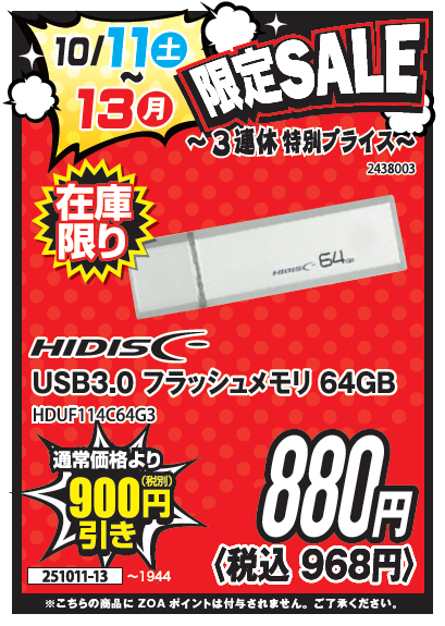 📣10/11~13 三連休限定価格 USBフラッシュメモリ64GB ▶ 通常価格より900円引き ▶ 特価 税抜880円💾 在庫限りの特別プライスです! #セール情報 #USBメモリ #限定特価 #OAナガシマ #ZOA #沼津 #三島 #駿東郡清水町 #函南