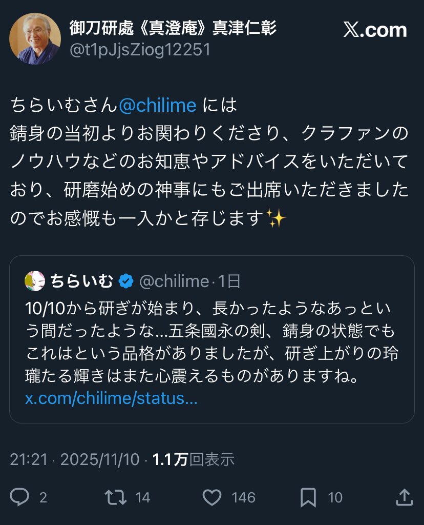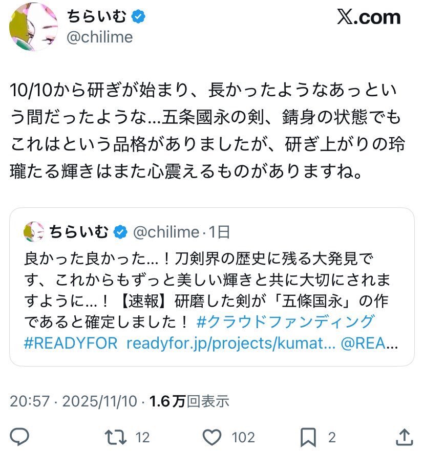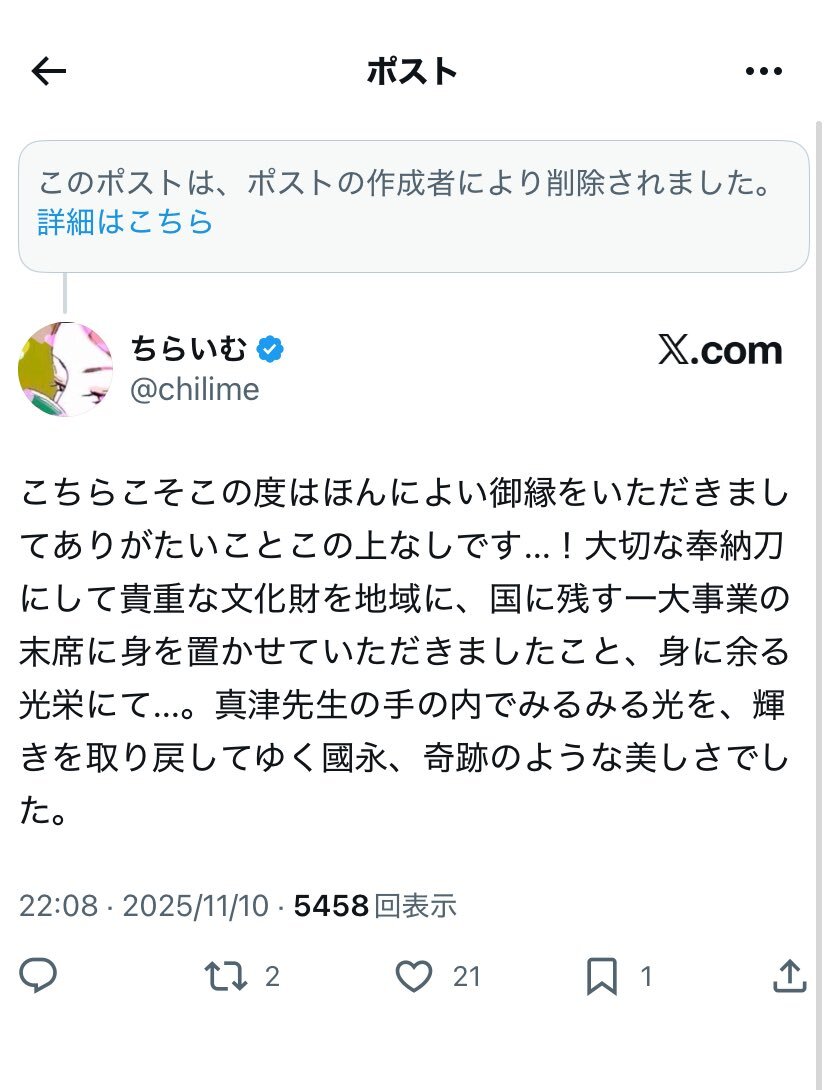 なぜか研師の方が ちらいむさん(ちらいむ氏) へのメッセージを消しています。 何があったんでしょう。 説明が無いと寄付者に、より一層の不安を与え善意を裏切ることになるのでは。 @Kumata_Jinja #クラファン #刀剣 #杭全神社 #日本刀 #国永 #鶴丸 #國永 #刀剣乱舞 pic.x.com/zEWYqGDcMk x.com/usapandapafe/s…