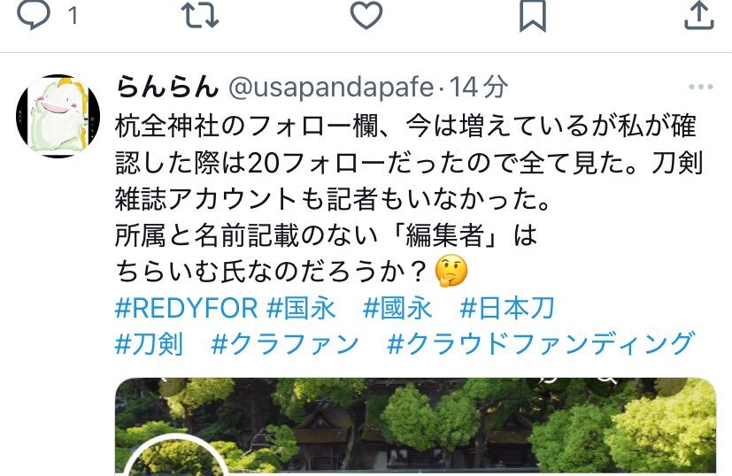 杭全神社のフォロー欄、今は増えているが私が確認した際は20フォローだったので全て見た。刀剣雑誌アカウントも記者もいなかった。 所属と名前記載のない「編集者」は ちらいむ氏なのだろうか?🤔 #REDYFOR #国永 #國永 #日本刀 #刀剣 #クラファン #クラウドファンディング pic.x.com/jyQRN7EY73