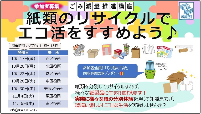 【エコ活推進!紙類リサイクル講座】 紙の #リサイクル について楽しく学べる講座を全7区の会場で行うよ! 実際に様々な紙の #分別 体験ができるから、環境に優しい #エコ な生活の実践に役立つこと間違いなし! 申込方法など詳細はこちら city.sakai.lg.jp/kurashi/gomi/g… pic.x.com/e5yaexV6Ba
