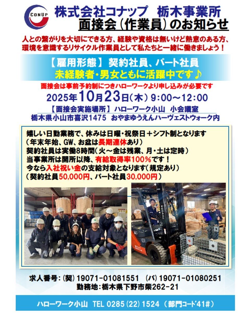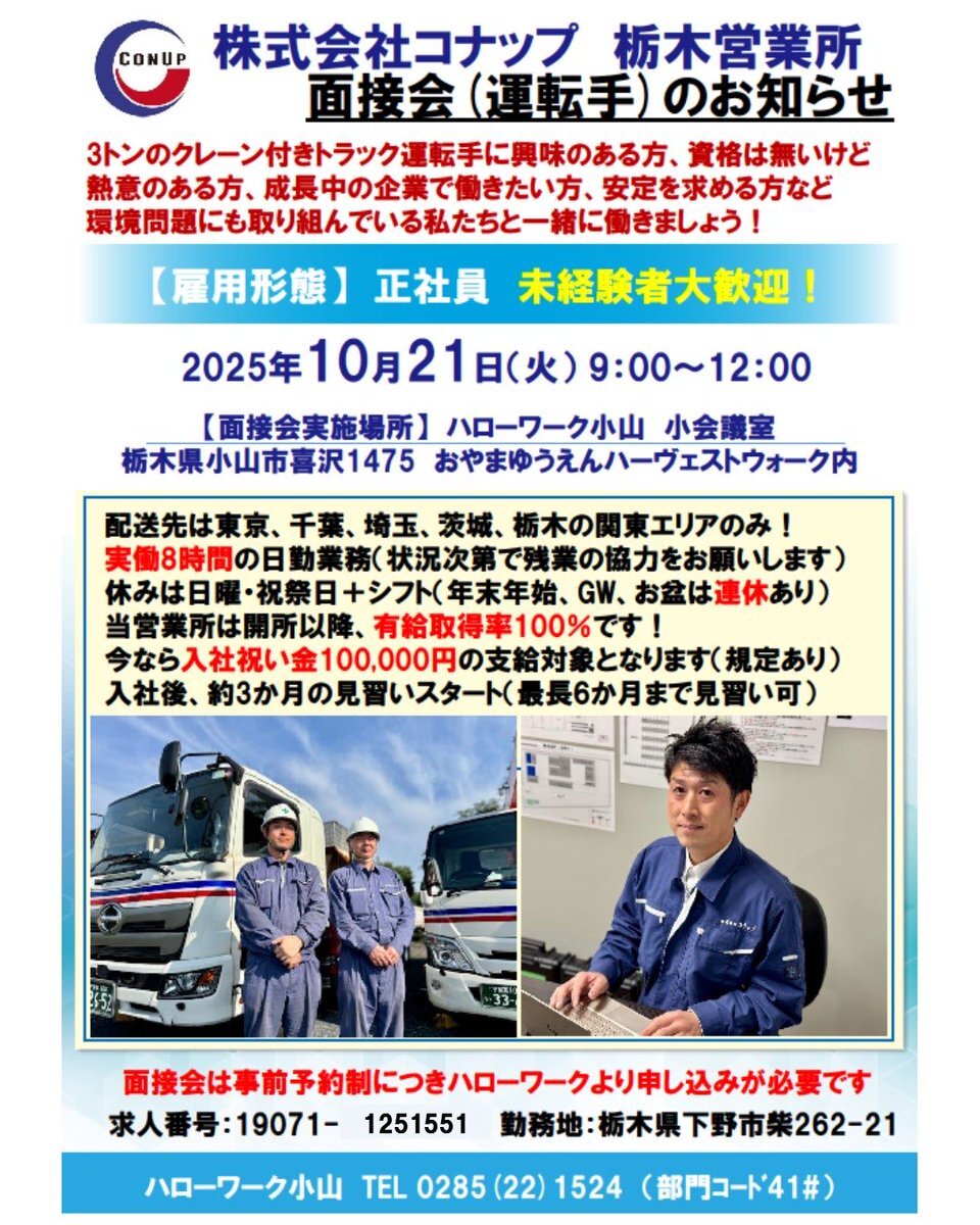 #ハローワークおやま から #面接会 のご案内📣 日時:10/21(火)、10/23(木) いずれも9時~12時 職種:運転手・作業員 ※予約制となりますので最寄りのハローワークでお申し込みください。 #小山市 #面接会 #コナップ #運転手 #クレーン付きトラック #倉庫作業員 #分別 pic.x.com/bBXoPGIjKa