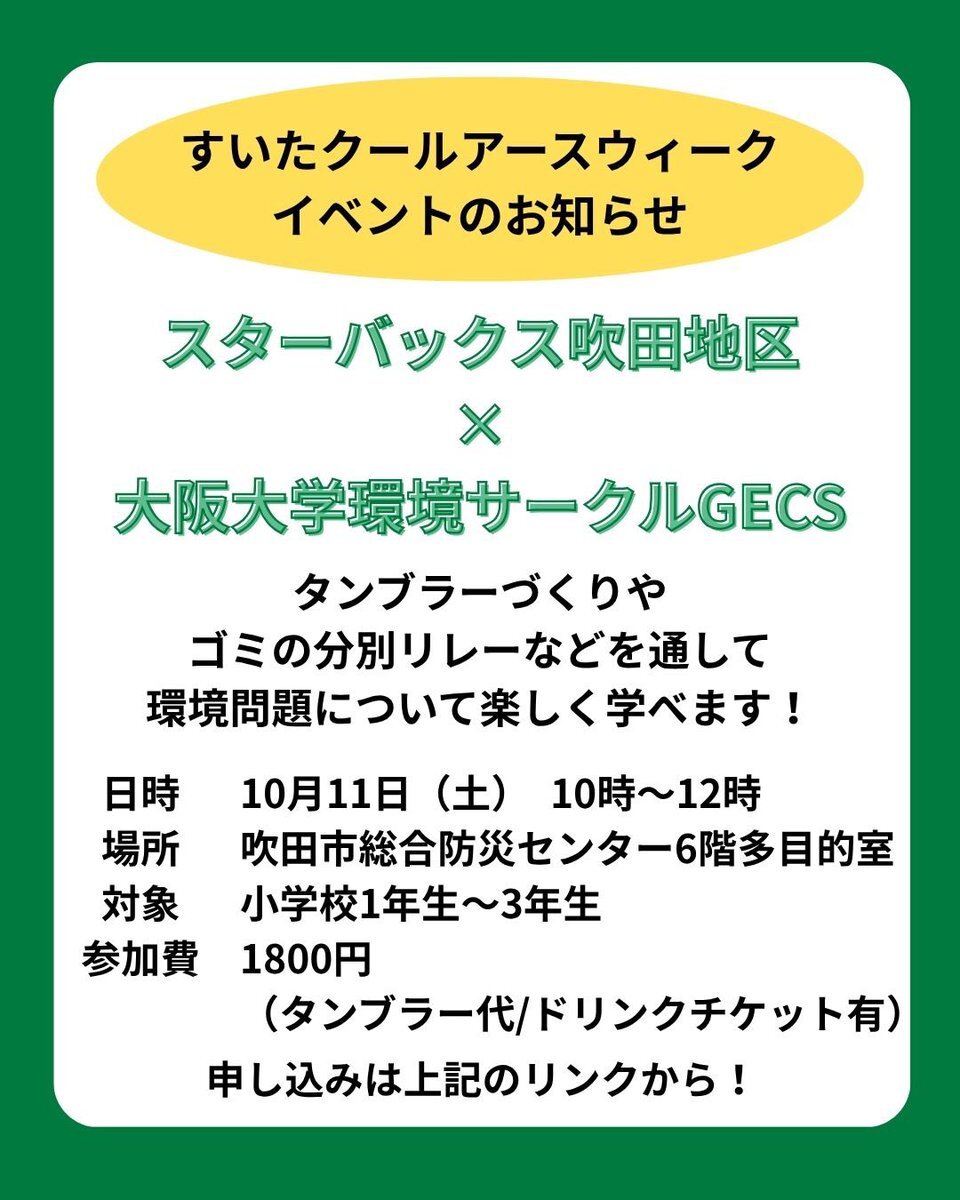 【イベントのお知らせ】 主催:スターバックス吹田地区 大阪大学環境サークルGECS 協力:吹田市 ▶申込は以下のリンクから! docs.google.com/forms/d/e/1FAI… #吹田市 #すいたクールアースウィーク #大阪大学環境サークルGECS #大阪大学 #環境 #スターバックス #スタバ #タンブラー #分別 #リサイクル pic.x.com/vNu2eMlmca