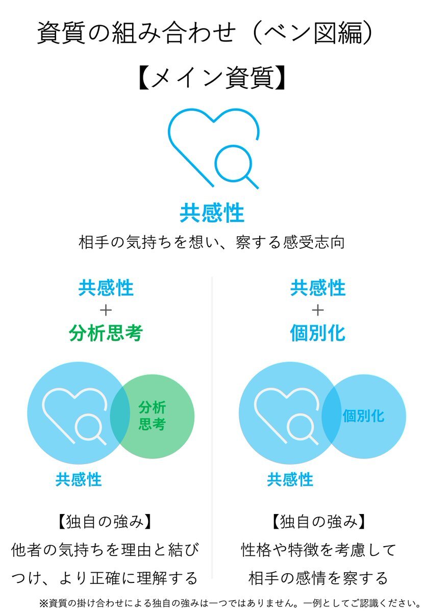 【メイン資質:共感性】 「分析思考」と組み合わさると、他者の気持ち知り、理由を理解して相手を知る。 「個別化」と組み合わさると、他者の性格や特徴を理解して気持ちを把握する。 #クリフトンストレングス #ストレングスファインダー #共感性 #ベン図 #分析思考 #個別化 pic.x.com/3cYL4c97hp