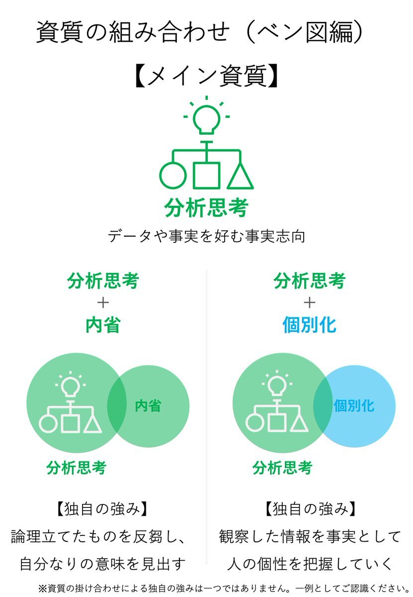 【メイン資質:分析思考】 「内省」と組み合わさると、整理で終わらせず、反芻することで自分なりの意味を見出す。 「個別化」と組み合わさると、人間観察したデータを元に相手の個性を把握する。 #クリフトンストレングス #ストレングスファインダー #分析思考 #ベン図 #内省 #個別化 pic.x.com/fGXddCFjRG