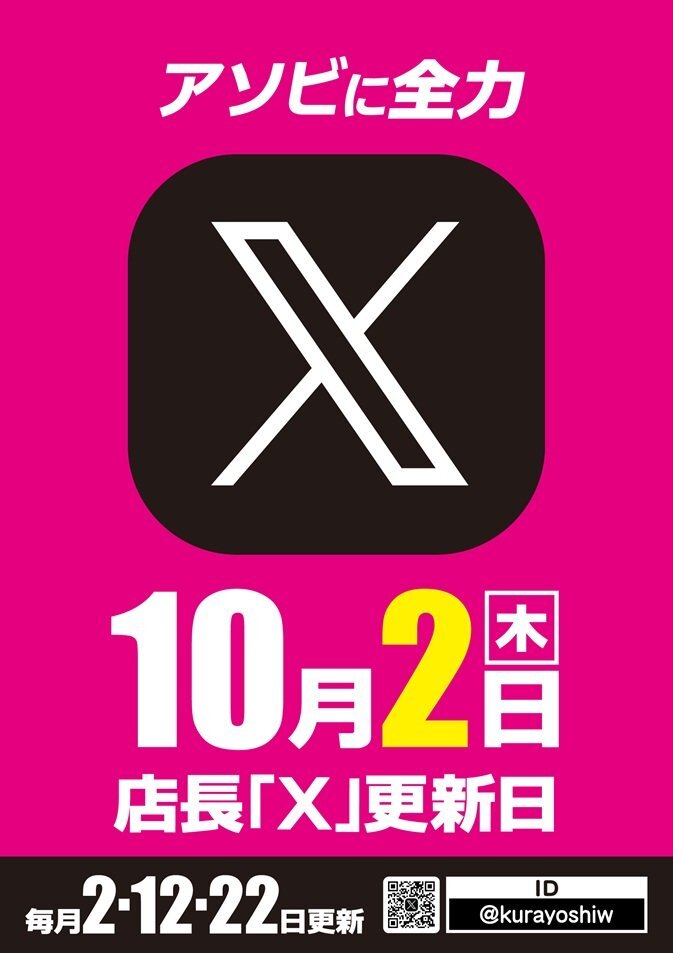 明日10月2日のワールドカップ+1は… 1日の勢いそのままに⤴️⤴️ おかわり🍚×店長X更新です📱✨ 9月も皆様のお陰でNo.1️⃣です☝️ 感謝です🙇 #このまちのいちばんに #店長X更新 #まったり更新 #前ちゃん #アソビに全力 pic.x.com/xf6rO9BW5k