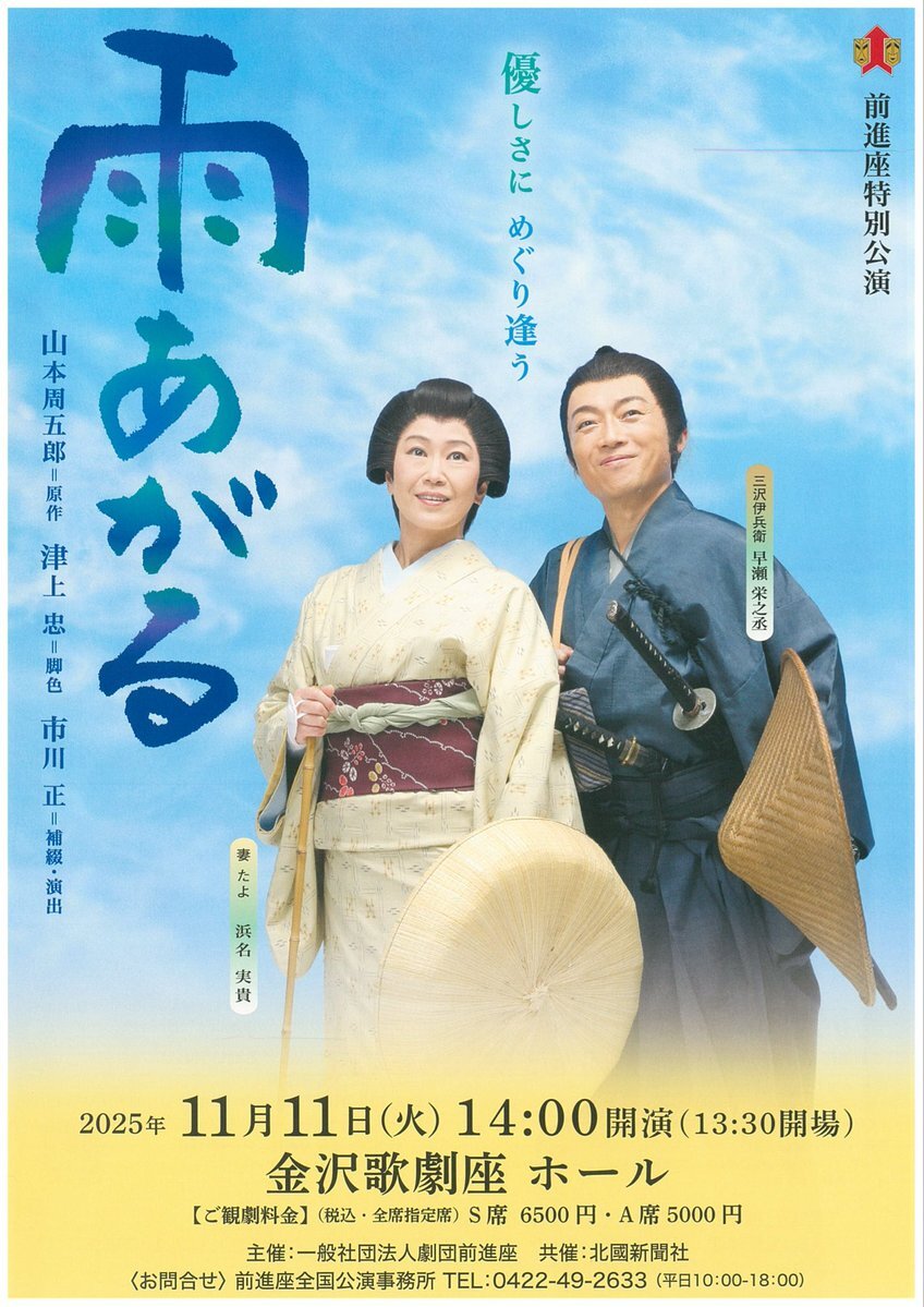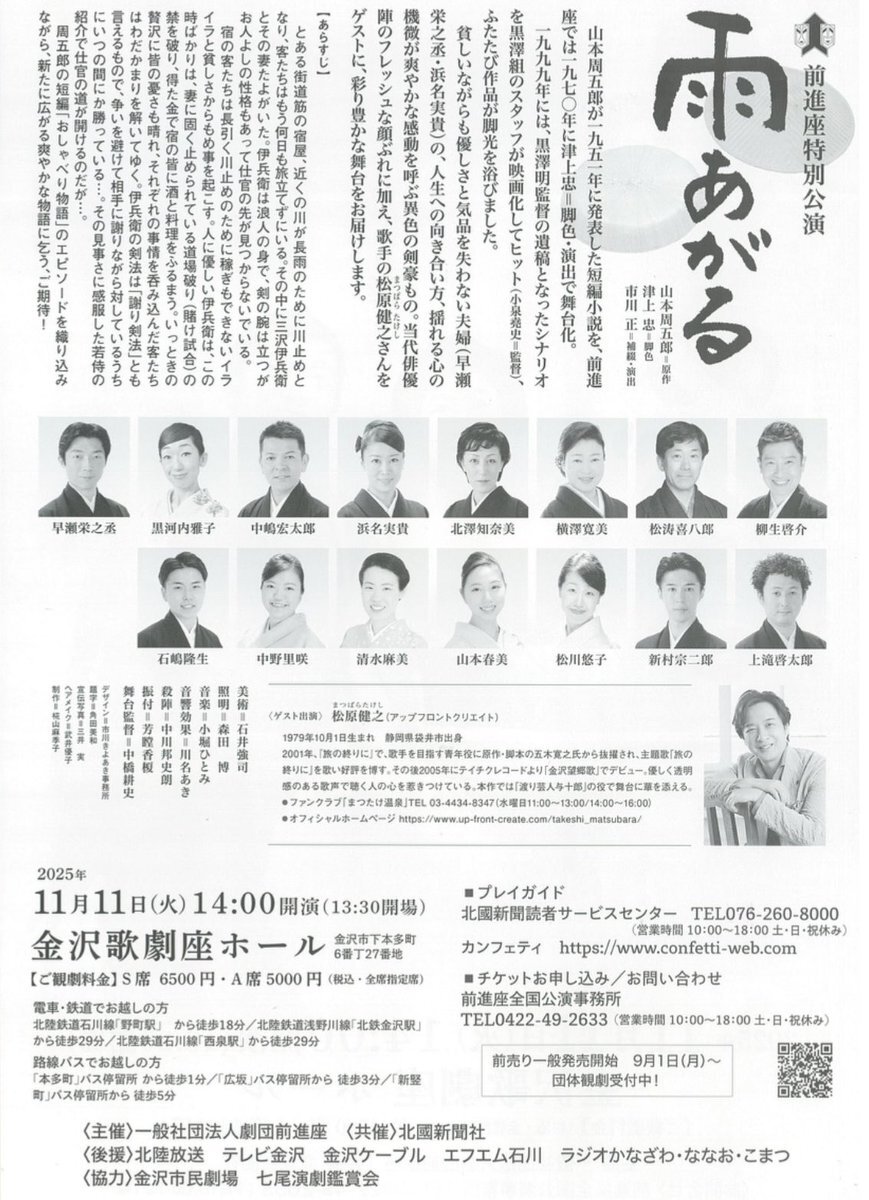 / #山本周五郎 =原作『#雨あがる』 \来週の公演情報! 大雨のため川留めとなった宿屋で、貧しくも気品を失わない夫婦と出会った人々が、小さな出来事の積み重ねの中で次第に心を通わせていく姿を描く異色の剣豪ものじゃ😌 歌手・ #松原健之 さんが渡り芸人 与十郎役でゲスト出演いたしまする😆