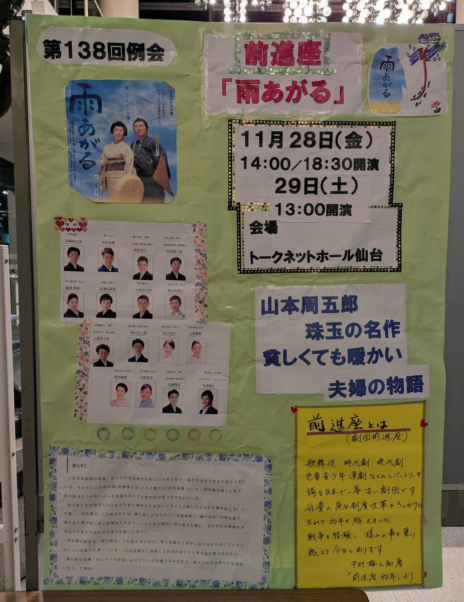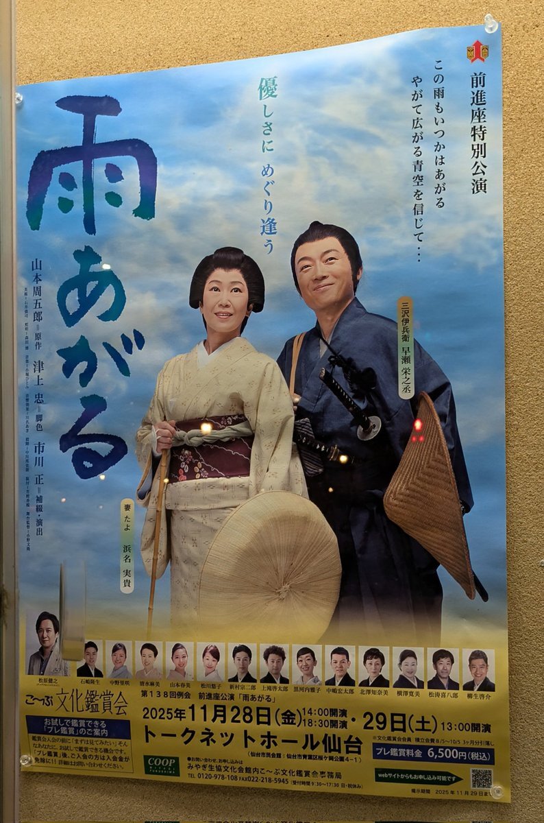 前進座特別公演「雨あがる」(山本周五郎原作)札幌公演を教文で観劇。1931年創立の前進座の舞台を観るのは久しぶりで2回目。悪者は除き、思いやりがあり優しい侍と彼を支える妻、彼らのまわりの人々を見ていて、ほっこり。自分も優しい気持ちになれた気がしました。とてもいい舞台でした。#前進座 pic.x.com/9cTcBxLnG0