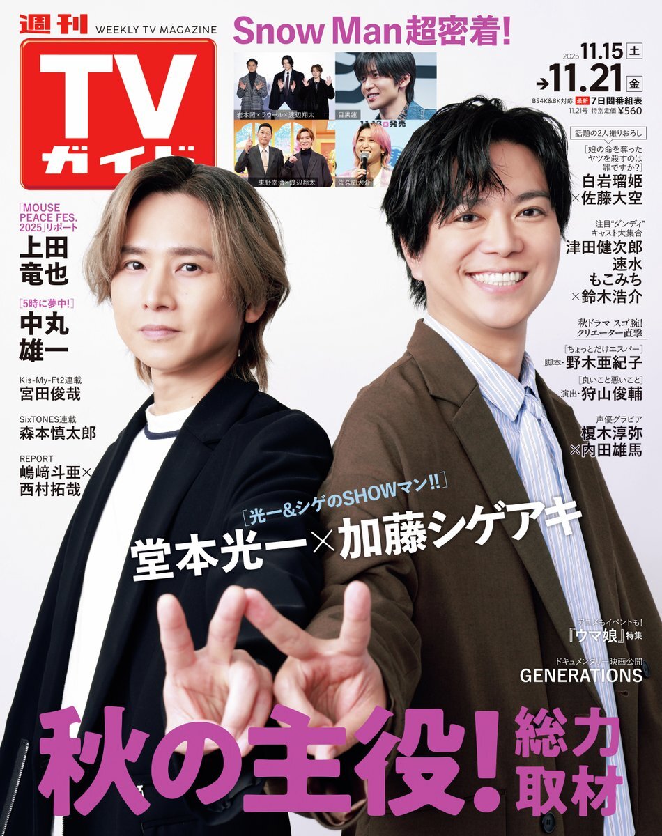/ 週刊TVガイド11/21号 発売中! \ 表紙は˚✧₊#堂本光一×#加藤シゲアキ˳✧༚ #光一シゲSHOWマン 📢秋の主役!総力取材 #上田竜也 #中丸雄一 #嶋﨑斗亜 #西村拓哉 #宮田俊哉 #森本慎太郎 #白岩瑠姫 #佐藤大空 #ウマ娘 #GENERATIONS ほか 詳細はこちら👇 🔗zasshi.tv/products/55676/
