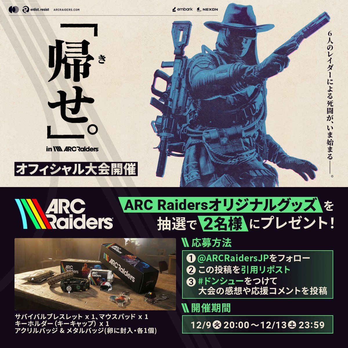 ◤ 公式グッズが当たる?! 「帰せ。」開催記念キャンペーン ◢ フォロー&引用リポストすると、 抽選で2名様に公式グッズが当たるチャンス! ▼応募方法 ① @ARCRaidersJP をフォロー ② この投稿を引用リポストし、「#ドンシュー」をつけて大会配信の応援をしよう! ▼対象期間