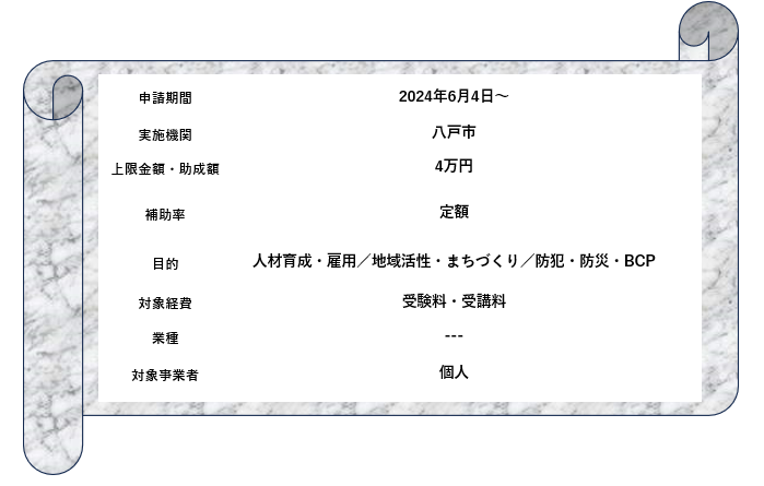 青森県八戸市の補助金。 八戸市防災士育成事業補助金 地域防災の担い手を育成することにより地域防災力の向上を図るため、防災士の資格の取得に要する経費を補助します。 city.hachinohe.aomori.jp/soshikikarasag… #助成金 #補助金 #奨励金 #助成金サポート #補助金サポート #リスキリング #生成AI pic.x.com/sgwjkzlNAx