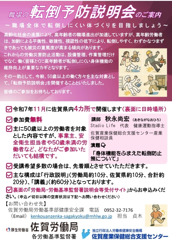 『転倒予防説明会』にご参加ください! #転倒 による #労働災害 が件数、休業日数ともに増加し、職場の新たなリスクとなっています。 「転倒予防説明会」を11月に県内4会場で開催いたします。 ▼詳しくはコチラ▼ roudoukyoku-setsumeikai.mhlw.go.jp/briefings/sear… pic.x.com/4utWWKCMME
