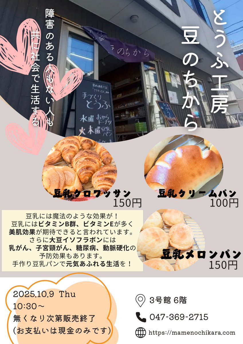 【お知らせ】 今週木曜9日(木)10時半から #豆のちから が本学で特別販売します‼ 秋学期も販売に来てくださることに なりました‼ とっても楽しみです🎵 #聖徳 #大学 #短大 #女子大 #私立 #学校 #大学生 #school #university # #豆腐 #人気 #手作り #パン #手作りパン #豆乳 #美肌 #健康 #効果 # pic.x.com/joZGtFkKG1