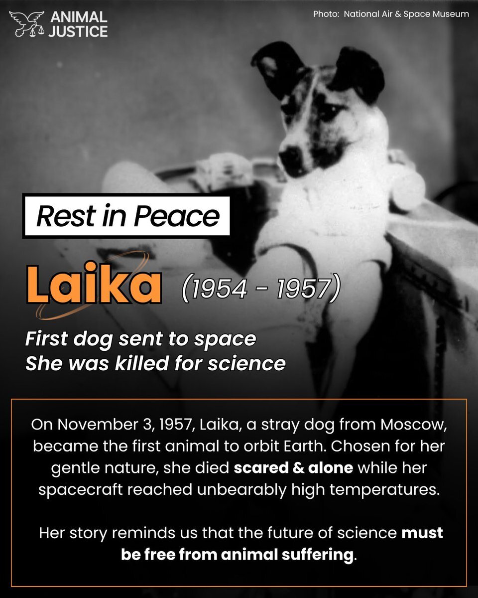 68 years ago today, #Laika was sent into space on an involuntary suicide mission. She became the first animal to orbit Earth, but died in agony just hours after launch as her capsule reached fatal temperatures. Today we remember Laika & all victims of animal testing ❤️🩹🐶