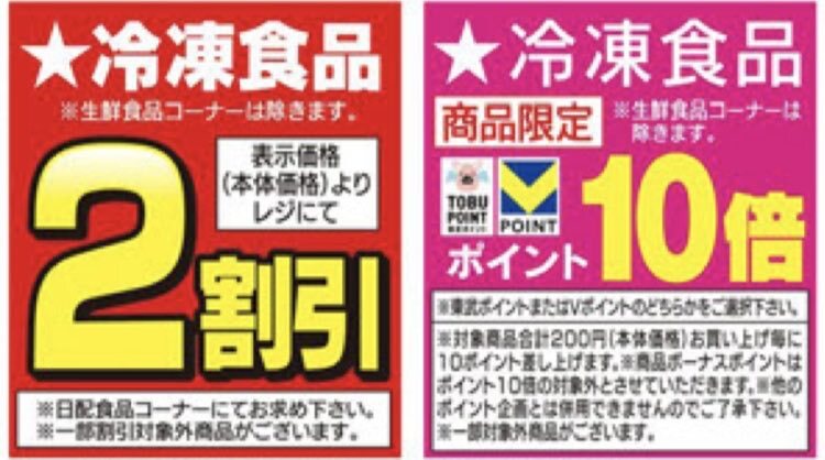 【#東武ストア #勝どき 店からのお知らせ】 本日10/12(日)は 冷凍食品が2割引🈹➕ポイント10倍🆙 500円の商品なら2割引で400円に さらにポイント10倍で20ポイント付きます‼️ まとめ買いの絶好のチャンスです💁🏻♀️ pic.x.com/eHbeZNMtI2