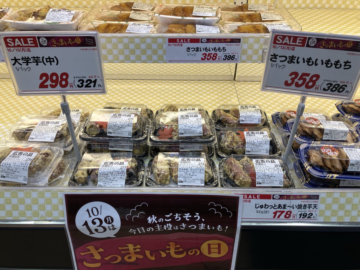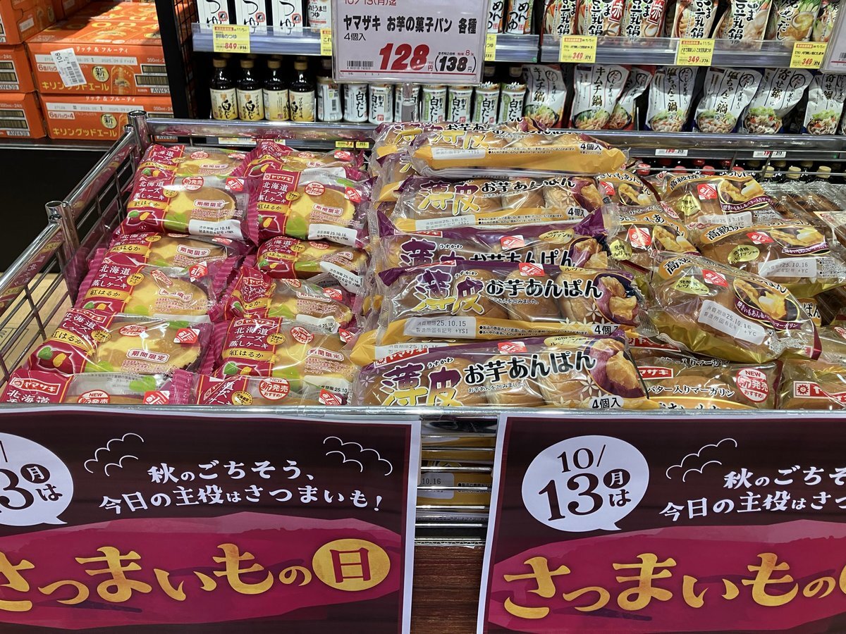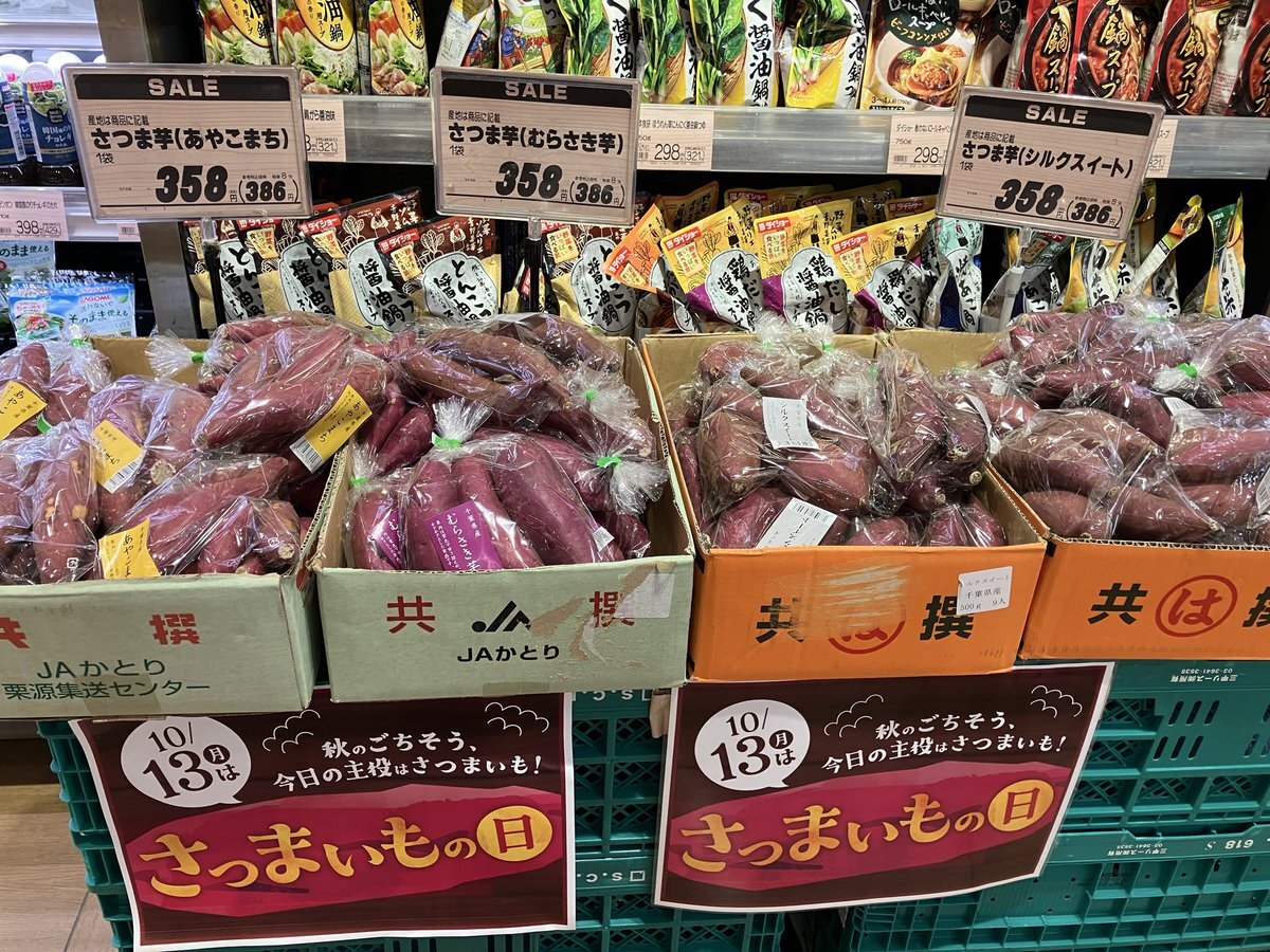 【#東武ストア #勝どき 店からのお知らせ】 本日10/13(月)はさつまいも🍠の日です♪ 大学芋・さつまいもいももち・焼き芋天 お芋の菓子パン🥐焼きいもタルト🥧 秋のごちそう、今日の主役はさつまいも🍠 pic.x.com/5OMWEgjitT