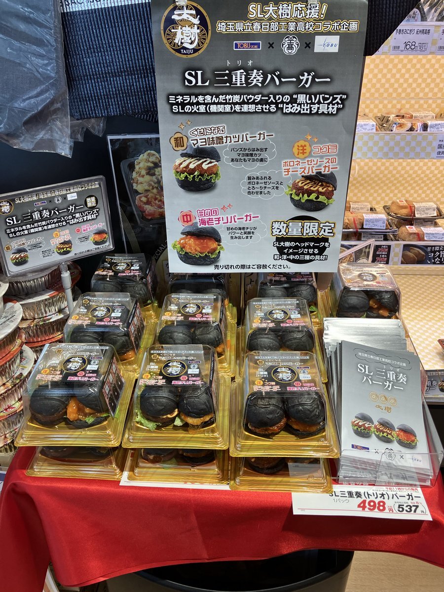 【#東武ストア #勝どき 店からのお知らせ】 『SL🚂三重奏バーガー🍔』新発売! 埼玉県立春日部工業高校コラボ企画🏫 ミネラルを含んだ竹炭パウダー入りの 『黒いバンズ』 SLの火室(機関室)を連想させる 『はみ出す具材』 数量限定の販売です💁🏻♀️ pic.x.com/HltY4VSZez