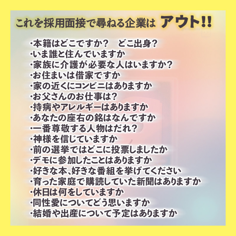 【面接で聞いてはいけない質問】 #勤労感謝の日 厚生労働省の指針「公正な採用選考の基本 」を読んでおこう #ねほりんぱほりん で不適切質問を面接でバンバン投げてくる企業が「コンプラ最低」と見抜かれてた pic.x.com/oZre8292lL