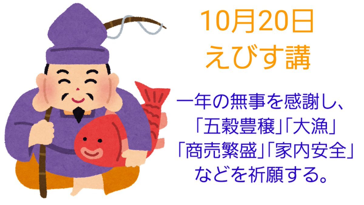返信先:@takeshima_staff#10月20日 #えびす講 #竹島宏 #ひろネット 日付は地方や社寺によって異なり、10月20日や11月20日の他にも「#十日えびす」として1月10日や、国民の祝日「#勤労感謝の日」の11月23日などに行う場合もある。 pic.x.com/w3wNluG2Ky