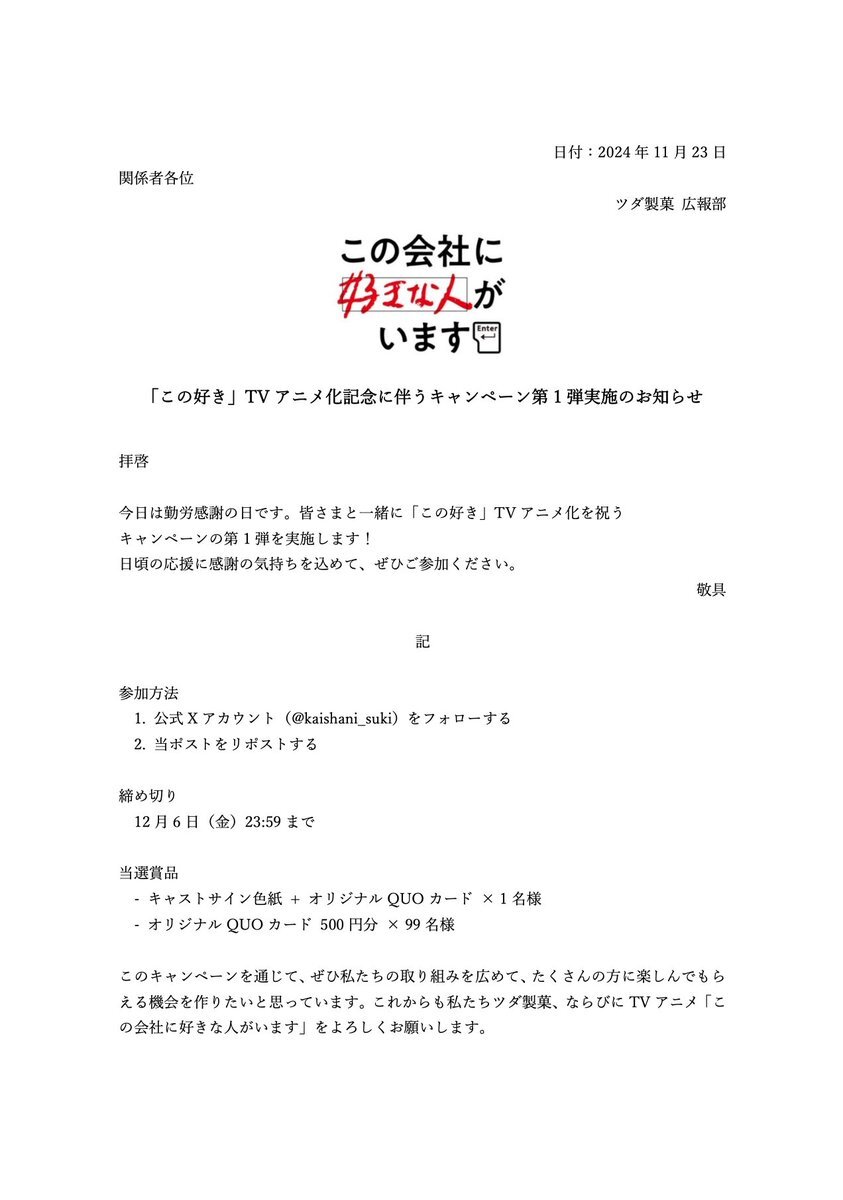 // 今日は #勤労感謝の日 皆さまお疲れ様です&㊗️#この好き アニメ化 キャンペーン第1️⃣弾🎊 \\ 🍫参加方法 ・公式X(@kaishani_suki)をフォロー ・当ポストをリポスト 🍫締切 ・12/6(金)23:59〆 🍫当選賞品 ・キャストサイン色紙+オリジナルQUOカード×1名様 ・オリジナルQUOカード500円分×99名様 pic.x.com/VjaPpYevCI